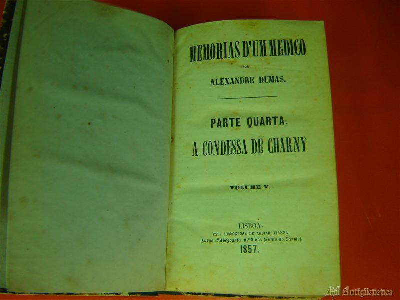 En cuadernacion en carton y cuero,año 1857,memorias de un medico escrito en portuges por Alex arden dumas,medidas de l libro 20x14cm,volumenV.