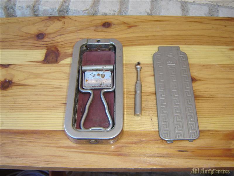 Antiguo afiladfor de cuchilla de afeitar,con medidas de 16cm cromado.Se le podría enviar más fotografías por wasap Y el medio de envió es por agencia de transportes que sale 5€.